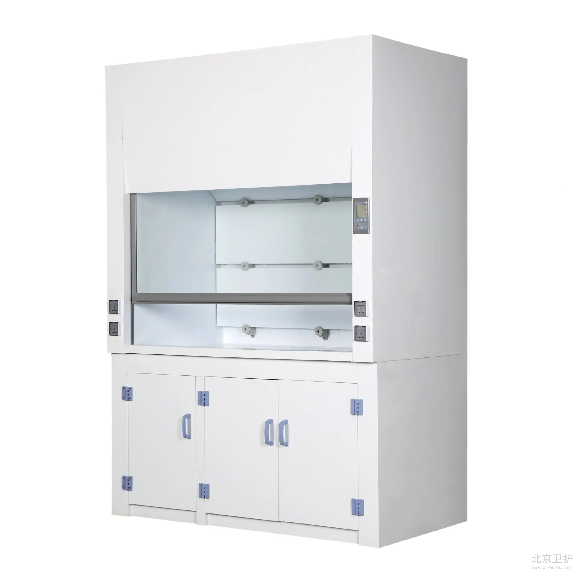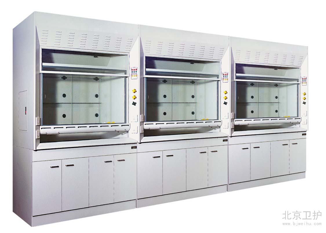 通風(fēng)柜是實驗室家具中必不可少的一種。在實驗室中起到排風(fēng)和換氣的功效。通風(fēng)柜的結(jié)構(gòu)是上下式,其頂部有排氣孔,可安裝風(fēng)機。上柜中有導(dǎo)流板,電路控制觸摸開關(guān),電源插座等 ,透視窗采用鋼化玻璃,可左右或上下移動。供人操作。下柜采用實驗邊臺樣式,上面有臺面,下面是柜體。臺面可安裝小水杯和龍頭。通風(fēng)柜的材料由多種的,全鋼、鋼木、全木、鋁木、塑鋼、PVC結(jié)構(gòu)等,其臺面是直接與操作者接觸的地方,由實芯理化板,不銹鋼板,PVC,陶瓷等材料組成。舊式通風(fēng)柜多用木材制成,但現(xiàn)代多為涂有環(huán)氧樹脂的鋼材制造。常見柜寬為1000、1200、1500、1800和2000毫米幾個規(guī)格,深700-900毫米,高1900-2400毫米??晒?-3個人同時使用。 通風(fēng)柜一般靠墻安裝。前方中間為可上下移動的透明門(多為玻璃),開啟高度一般為100-600毫米。門后為實驗進行的工作面,有水管、下水道、電源、真空泵、氣路管線等實驗需要的連接,上有帶保護罩的燈照明。空氣由柜內(nèi)前上方的排風(fēng)扇抽走后,或經(jīng)管道引到別處(稱為全通風(fēng)),或經(jīng)過濾重新循環(huán)使用(成為無管通風(fēng))。多數(shù)通風(fēng)柜在(1)排氣量過小(2)前方玻璃門開啟過大的時候會發(fā)出警報,提醒操作者注意,一般玻璃門開啟后操作口風(fēng)速不應(yīng)低于0.5m/s,內(nèi)部的排風(fēng)扇速度和燈都有開關(guān)可調(diào)。使用的時候人站或坐于柜前,將玻璃門盡量放低,手通過門下伸進柜內(nèi)進行實驗。由于排風(fēng)扇通過開啟的門向內(nèi)抽氣,在正常情況下有害氣體不會大量溢出。